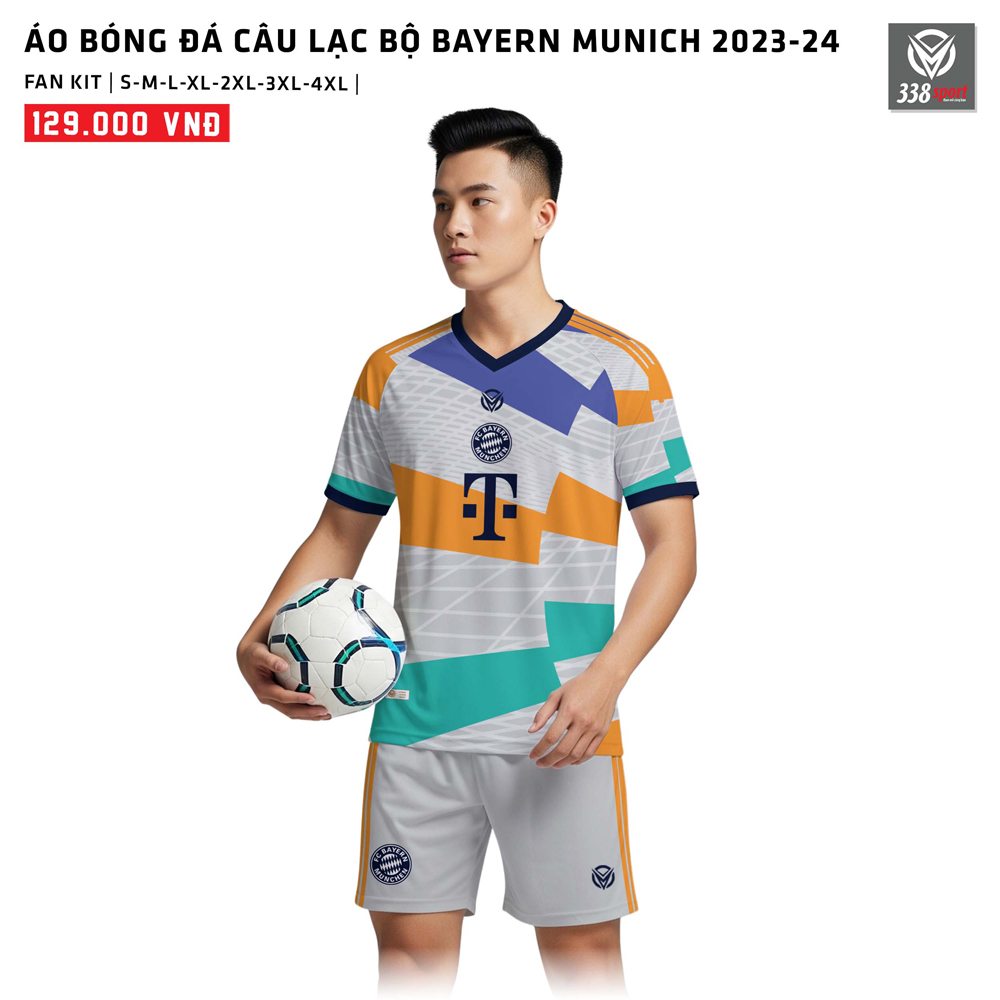 Áo Fan Kit Bayern Munich 2023-24 nổi bật với thiết kế màu xám trắng trung tính kết hợp các mảng màu cam, xanh dương và xanh lá cùng họa tiết hiện đại, không chỉ thể hiện tinh thần thể thao mà còn phù hợp mặc thời trang hằng ngày.