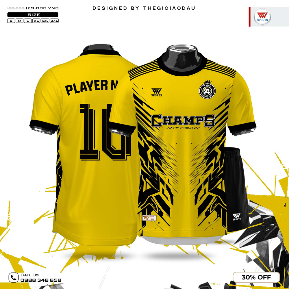 Mẫu áo bóng đá “CHAMPS” nổi bật với tone vàng neon kết hợp đen cá tính, thiết kế sắc sảo và giá cực kỳ ưu đãi chỉ 129.000 VND – lựa chọn tuyệt vời cho mọi đội bóng phong trào.