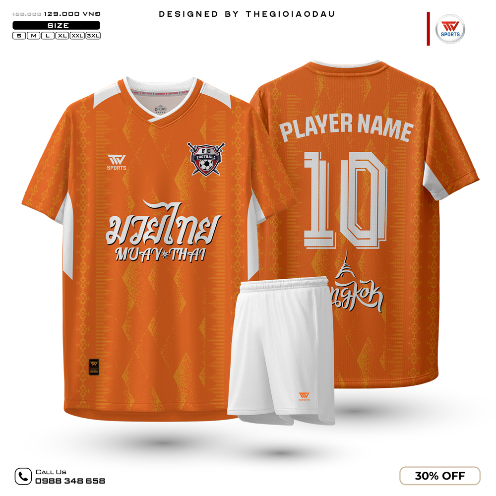 Áo thể thao nam màu cam phối trắng với họa tiết truyền thống Thái Lan mang đến phong cách nổi bật, đậm chất văn hóa và tối ưu cho các hoạt động thể thao cường độ cao.
